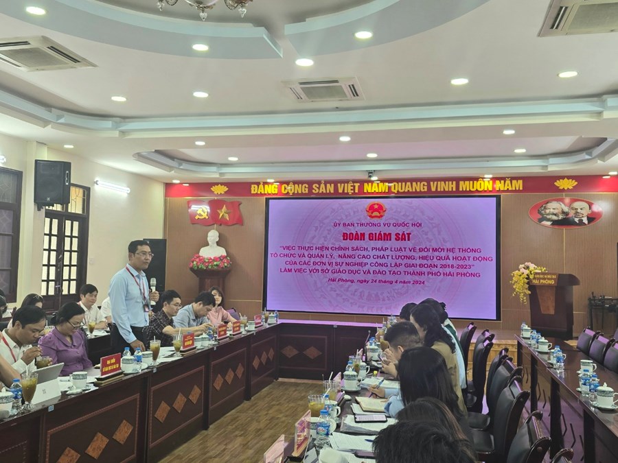 Tại buổi làm việc, ông Bùi Văn Kiệm -Giám đốc Sở GDĐT- báo cáo về việc thực hiện chính sách pháp luật về đổi mới hệ thống tổ chức và quản lý, nâng cao chất lượng, hiệu quả hoạt động của các đơn vị sự nghiệp công lập giai đoạn 2018-2023 tại Hải Phòng. Theo đó, trong giai đoạn, Sở GDĐT đã tham mưu thành phố ban hành 10 Nghị quyết và đang chủ trì xây dựng 01 đề án về chế độ chính sách đối với đơn vị sự nghiệp của ngành. Một số cơ chế, chính sách nổi trội, đi vào thực tiễn và phát huy hiệu quả thiết thực, như: đãi ngộ trong phát hiện, đào tạo, bồi dưỡng học sinh giỏi, tuyển chọn đội ngũ giáo viên giỏi; chế độ chi hỗ trợ lao động hợp đồng vị trí nấu ăn trong trường mầm non; chính sách hỗ trợ 100% học phí cho học sinh mầm non và học sinh trung học; … Đồng chí Giám đốc Sở GDĐT đã báo cáo những kết quả cụ thể của ngành giáo dục Hải Phòng trong việc sắp xếp tổ chức lại các đơn vị sự nghiệp công lập, quản lý biên chế, thúc đẩy xã hội hóa; đồng thời phân tích, đánh giá tình hình và nêu lên một số đề xuất, kiến nghị.